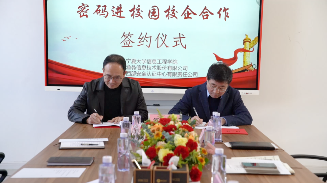 在第八个国家宪法日来临之际,为深入贯彻落实《中华人民共和国密码法》,进一步加快密码专业人才队伍建设步伐,打通我区密码产学研创新链、价值链,12月1日,“密码进校园校企合作签约仪式”在宁夏大学信息工程学院成功举行。此次签约仪式由宁夏密码管理局指导,宁夏商用密码协会会员单位凯发k8官网信息技术股份有限公司、西部安全认证中心有限责任公司同宁夏大学信息工程学院签署战略合作协议,共同为我区密码学科建设、密码实训基地建设、密码人才培养贡献力量。宁夏密码管理局副局长李大苞,商密处副处长丁杰,宁夏大学信息工程学院党委书记武林波、院长冯锋、副书记孙莉、副院长杨军、学科主任李贯峰,凯发k8官网信息技术股份有限公司董事长郭刚,西部安全认证中心有限责任公司常务副总经理耿方,区内其他商密企业代表等出席了签约仪式,签约仪式由宁夏商用密码协会秘书长赵军主持。
